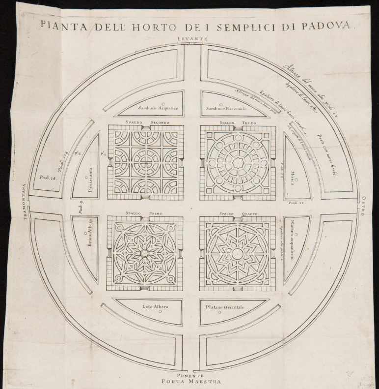 Pianta dell'horto dei semplici di Padova Planimetria dell'Orto botanico contenuta nell'opera "L’horto de i semplici di Padova, ove si vede primieramente la forma di tutta la pianta con le sue misure: & indi i suoi partimenti distinti per numeri in ciascuna arella, intagliato in rame. Opera che serve mirabilmente alla memoria de gli studiosi". 1591