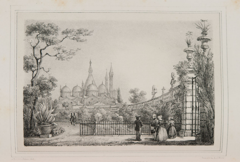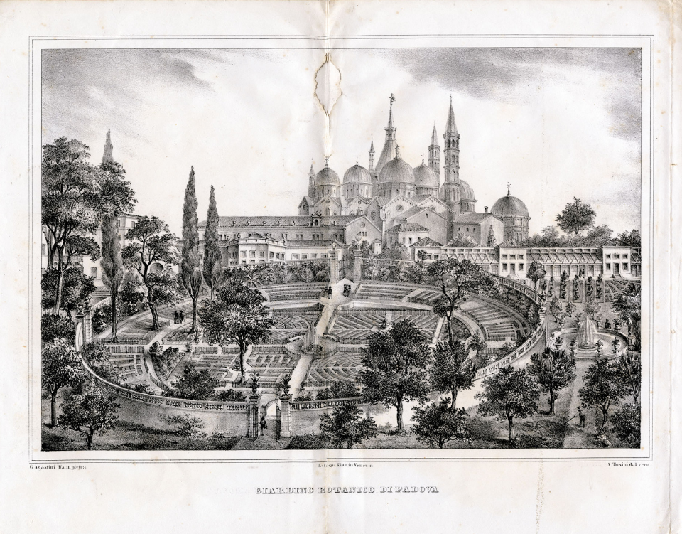 Veduta panoramica dell'Orto botanico in Padova Litografia raffigurante una veduta dell'Orto botanico contenuta nell'opera "Guida all’imp. regio orto botanico in Padova" di Antonio Ceni. 1854